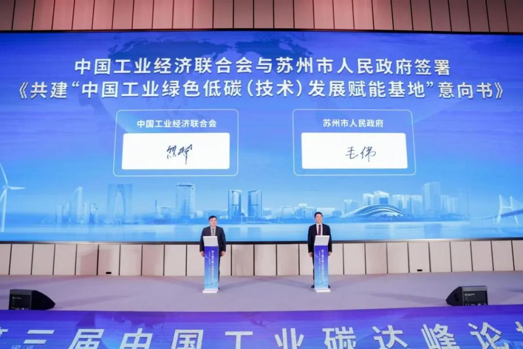 论坛上,中国工经联党委书记、执行副会长兼秘书长熊梦和苏州市副市长毛伟代表中国工经联和苏州市人民政府共同签署了《共建“中国工业绿色低碳(技术)发展赋能基地”合作意向书》。基地将依托苏州市丰富多元的产业基础,以及中国工业碳达峰“领跑者”企业的绿色技术、产品和整体解决方案,以需求为导向,共同在长三角地区打造工业绿色低碳发展的新高地。