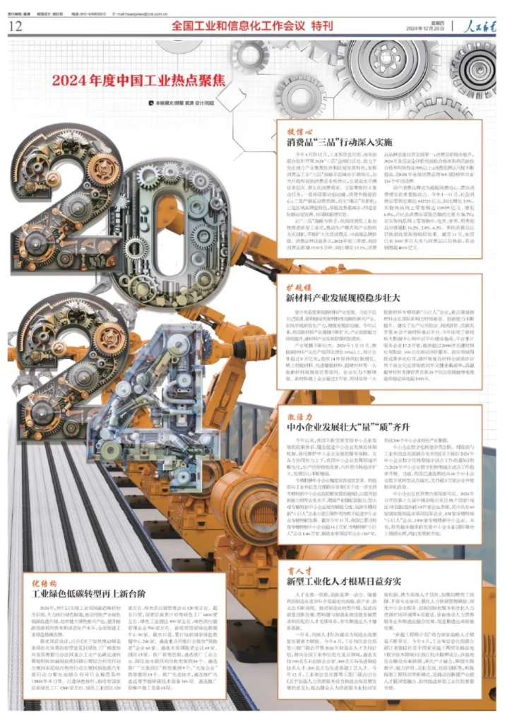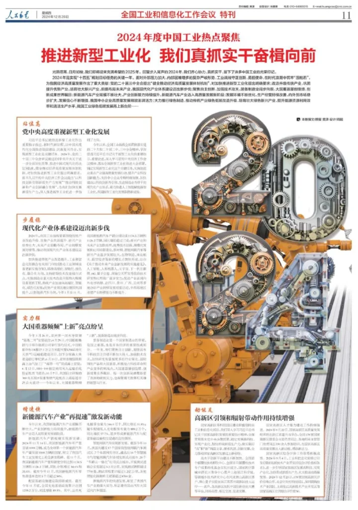 2024年是实现“十四五”规划目标任务的关键一年。面对外部压力加大、内部困难增多的复杂严峻形势,工业战线守正创新、勇担使命,在时代浪潮中筑牢“压舱石”,为我国经济高质量发展作出了重大贡献:党的二十届三中全会提出“健全推动经济高质量发展体制机制”,对加快推进新型工业化提出明确要求;改造升级传统产业,巩固提升优势产业,培育壮大新兴产业,前瞻布局未来产业,我国现代化产业体系建设迈出新步伐;聚焦自主创新,加强技术攻关,装备制造业阔步向前,大国重器屡创佳绩,创新成果世界瞩目;新能源汽车产业规模不断壮大,产业创新能力持续提升,新能源汽车产业迈入高质量发展新阶段;发展环境不断优化,生产经营持续改善,内外贸市场稳步扩大,发展信心不断增强,我国中小企业高质量发展释放澎湃活力;大力推行绿色制造,推动传统产业绿色低碳改造升级,培育壮大绿色新兴产业,提升能源资源利用效率和清洁生产水平,我国工业绿色低碳发展再上新台阶……